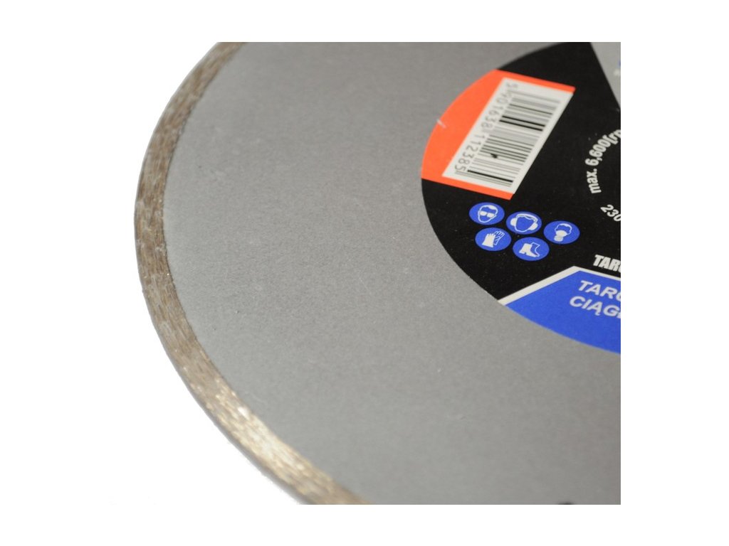 Diamantový kotouč 230 mm je vhodný pro suché i mokré řezání. Kotouč je vhodný do každé úhlové brusky (flexi) na 230mm. Řezná čepel obsahuje 20% syntetického diamantu třídy JR4, přičemž čepel je vyrobena z kobalt-niklové oceli s přídavkem mědi, což zvyšuje její odolnost proti praskání a umožňuje dosahovat vysokých úhlových rychlostí až 80 m / s. Díky použití nejkvalitnějších diamantů se kotouč vyznačuje vysokou řeznou účinností. Stabilní tělo čepele zajišťuje optimální rotaci.