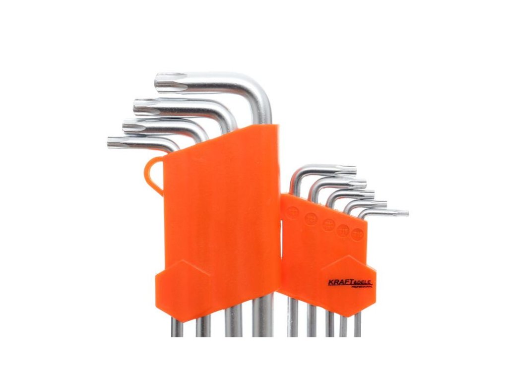 Sada L-klíčů TORX (KD10295) od značky KRAFT&DELE obsahuje několik klíčů s tvarem "L", které jsou určeny pro použití s hroty typu TORX. Tyto klíče jsou často používány při montáži a demontáži šroubů s torxovými hlavicemi, což jsou speciální druhy šroubů se šestihranným otvorem ve tvaru hvězdy. Sada je vyrobena z vysoce kvalitní chrom-vanadové oceli CrV, která se vyznačuje pevností a pružností. Oboustranné klíče ve tvaru L.