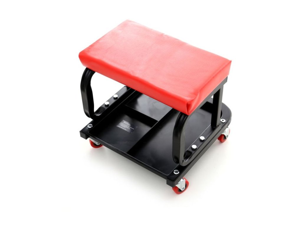 Pohodlné sedadlo potažené příjemným, odolným a snadno omyvatelným materiálem. Pojízdná dílenská stolička poskytuje pohodlí i při dlouhodobé činnosti. Stolička je díky hliníkovému skeletu velmi odololná s dlouhou životností. Součástí poličky je i polička vhodná na nářadí, klíče a šrouby, které používáme při práci. Stolička je usazena na 4 pevných otočných kolečkách, díky čemuž je snadné s celou stoličkou a v sedě pohybovat.