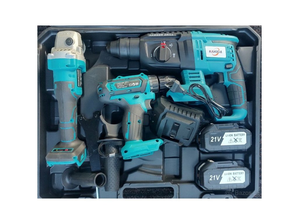 Sada aku nářadí obsahuje aku vrtačku, příklepovou vrtačku, úhlovou brusku, dvě Li-Ion baterie 21V (2,0 Ah), rychlonabíječku a praktický přepravní kufr. Ideální pro každodenní hobby použití, ale také pro drobné stavební práce.