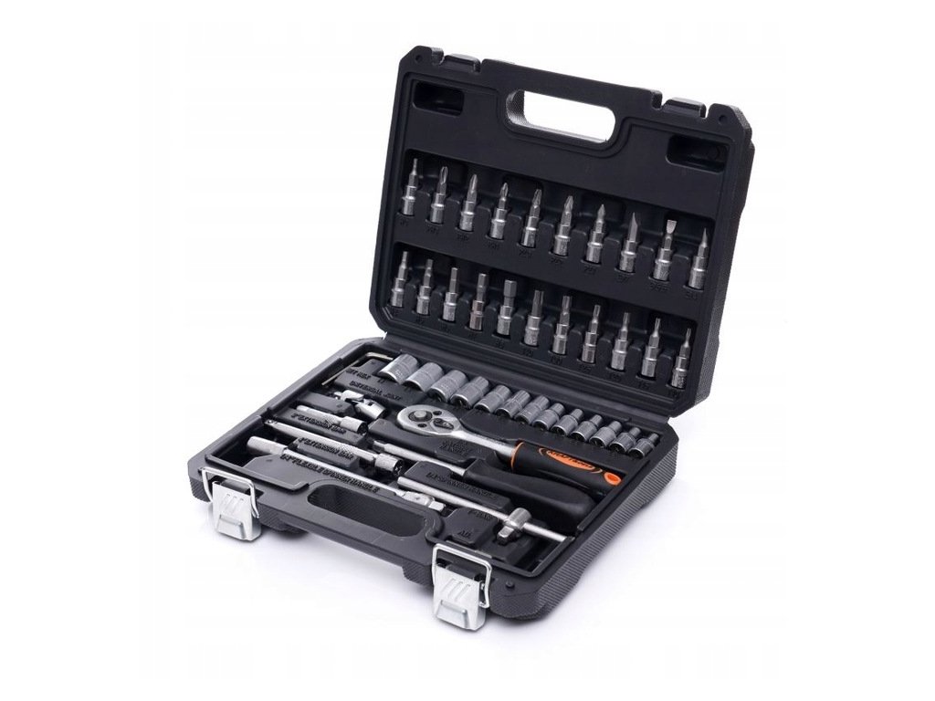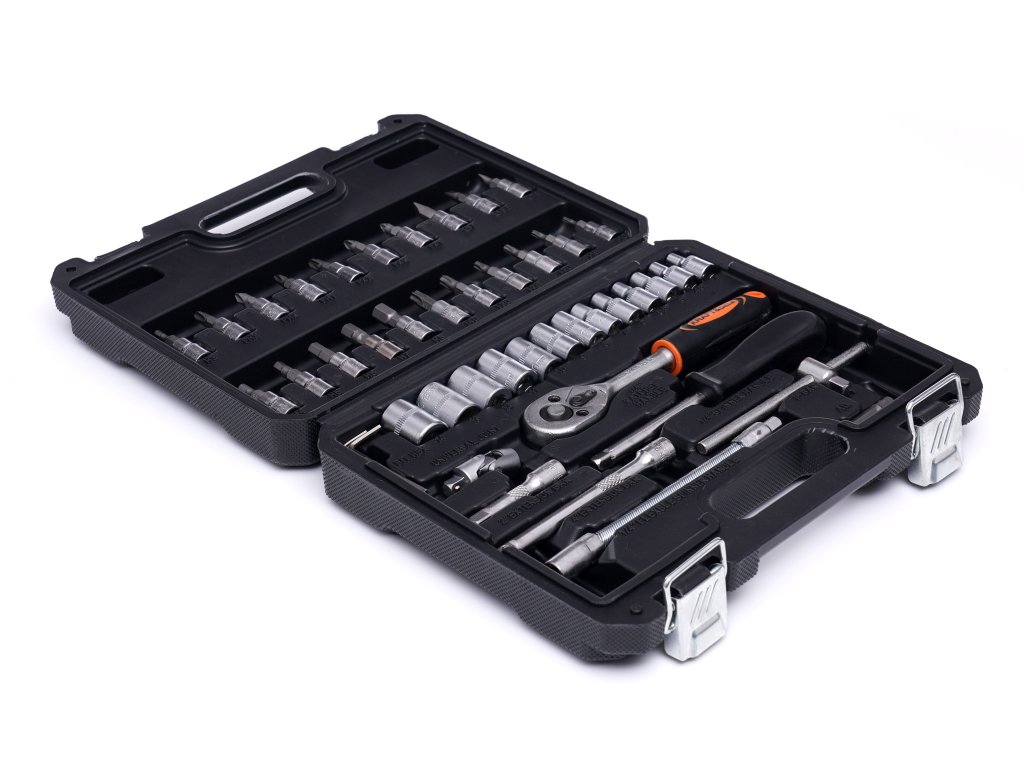 Celá sada se skládá ze 46 různých prvků, které zajistí správný výběr nářadí pro vaše potřeby. Nástroje jsou vyrobeny z tvrzené chromvanadiové (CrV) oceli určené pro dílenské nářadí. Chrom zaručuje oceli odolnost proti korozi, oxidaci, otěru a vysokou odolnost vůči vysokým teplotám. Přídavek vanadu inhibuje růst zrn během zpracování a zároveň zvyšuje tažnost jak kalené, tak temperované formy.